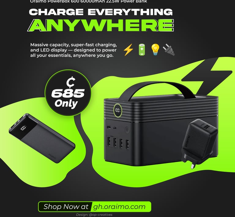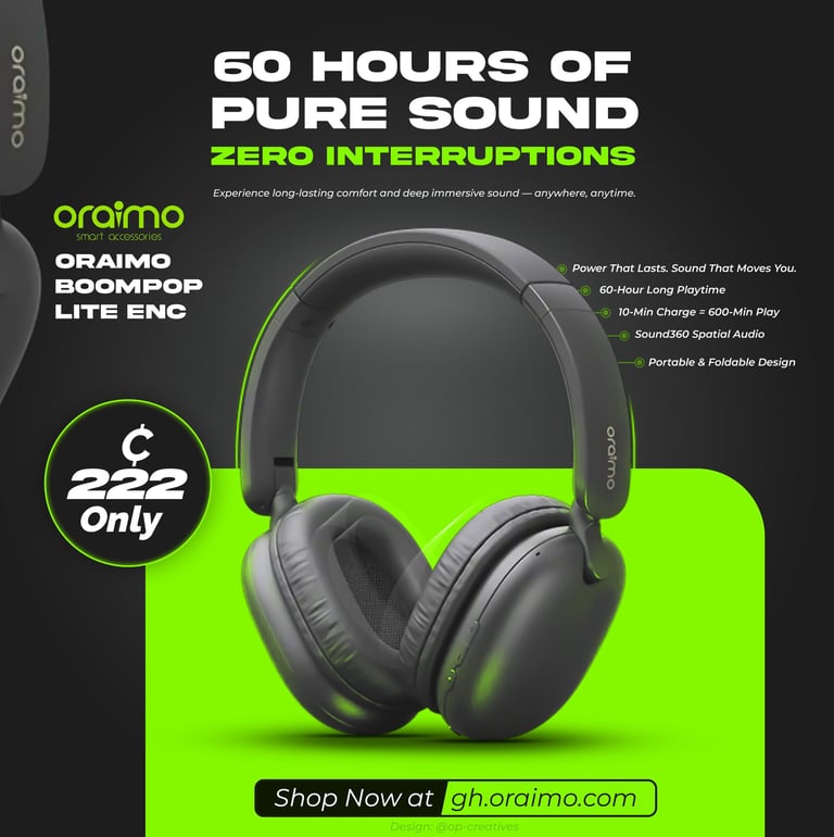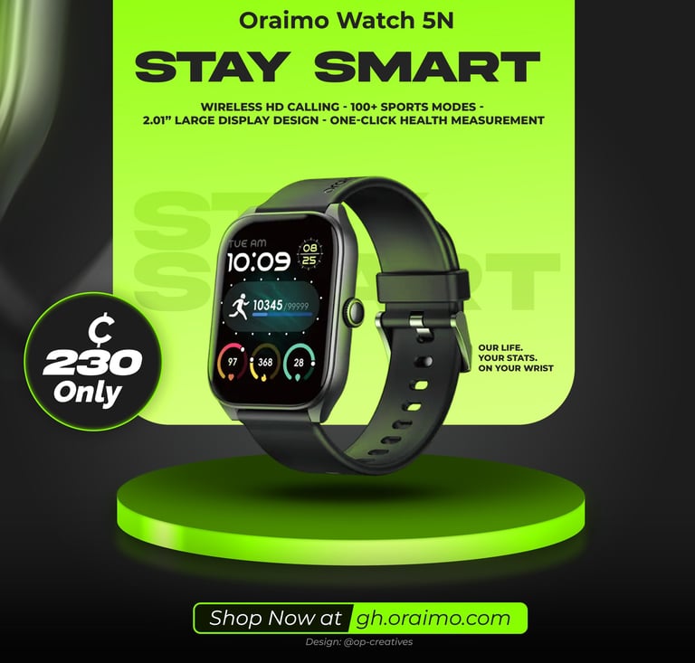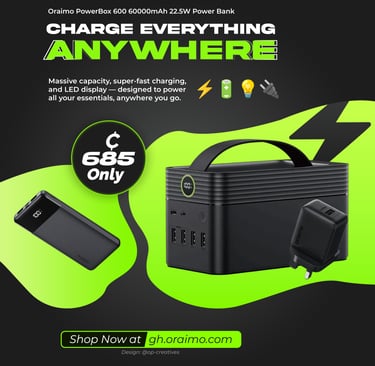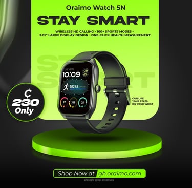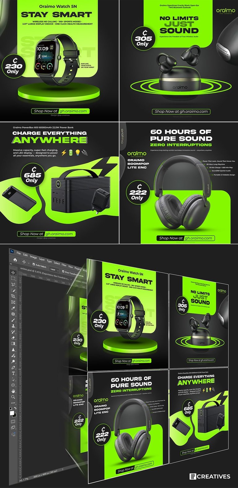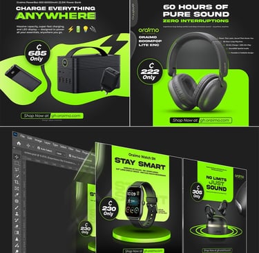 Discover a bold fusion of technology and creativity in this product design series crafted for Oraimo. Each visual showcases clean composition, vibrant neon tones, and sharp 3D detailing, bringing premium tech products like smartwatches, earbuds, power banks, and headphones to life.